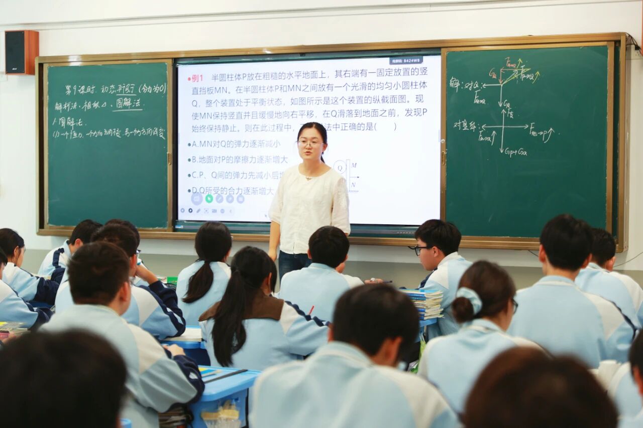 苑蒙老师以高考真题导入课堂,引导学生自主分析、挖掘考点,瞬间激发了学生的探究兴趣。课上,苑老围绕“动态平衡”展开系统讲解,从“物体受力状态缓慢变化”的概念界定,到“每一个状态均为平衡状态”的核心特点,再到解析法、图解法、相似三角形、辅助圆法四大常用解题方法,讲解细致入微、逻辑清晰。