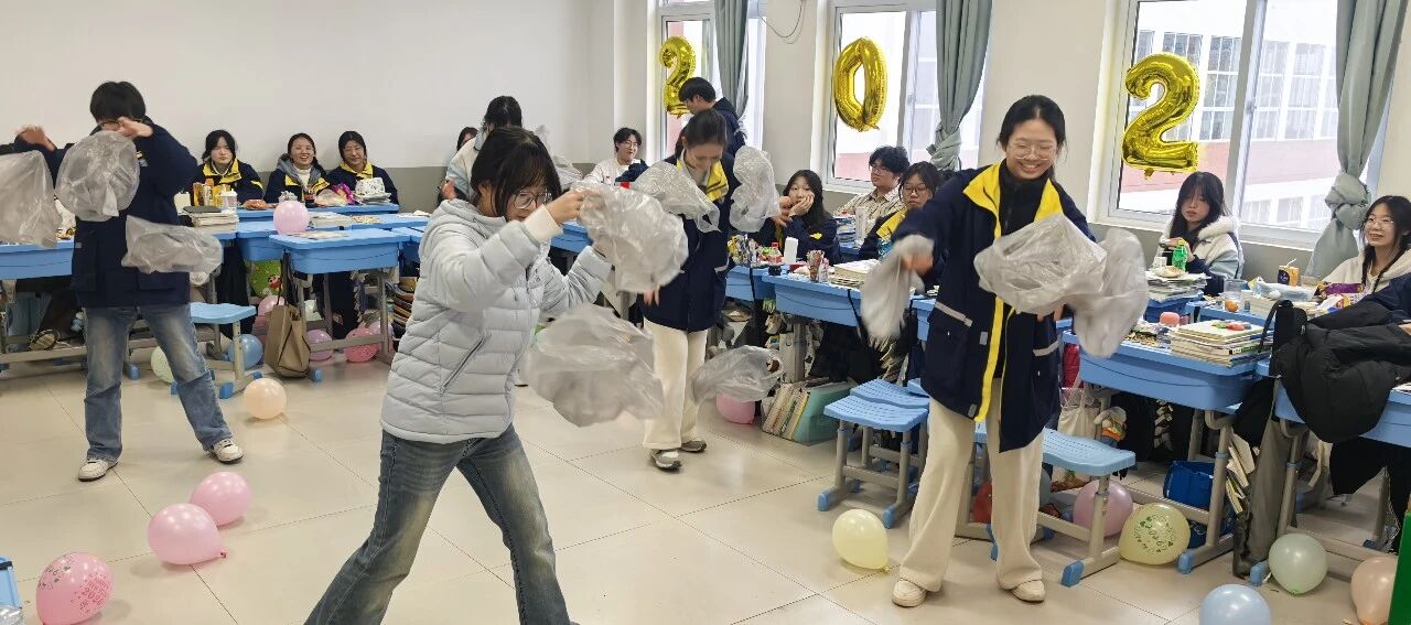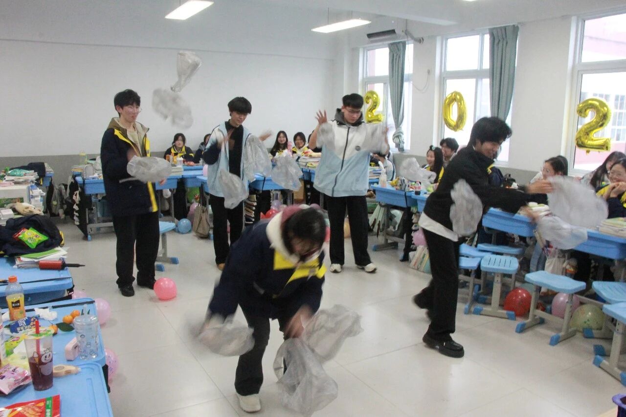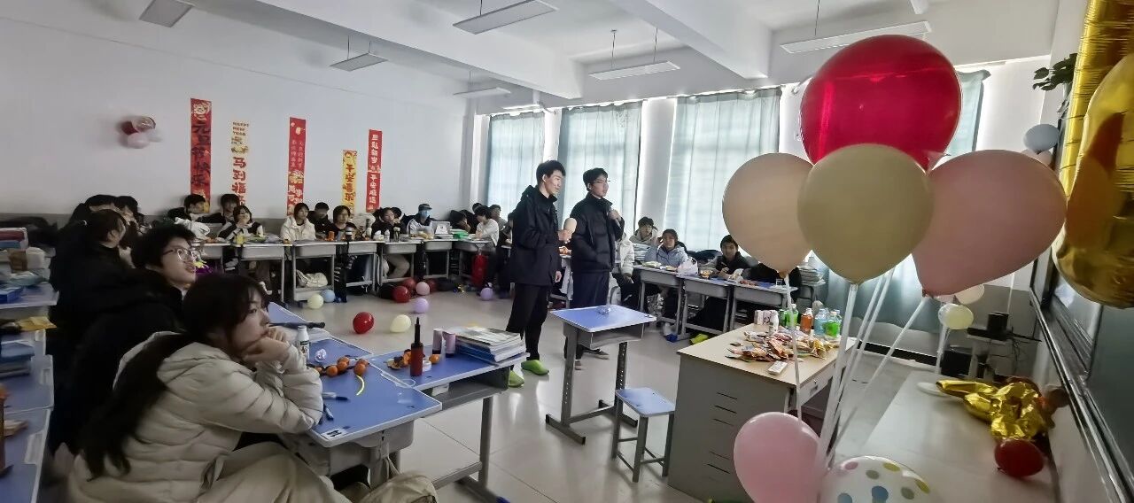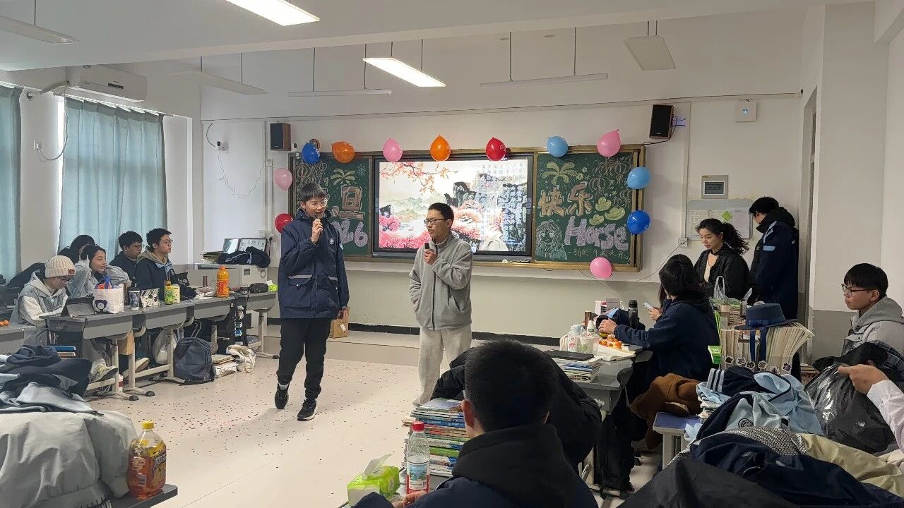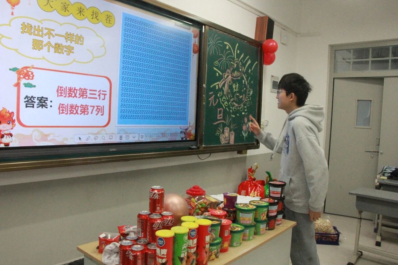 金声玉振辞旧岁,欢歌笑语迎新年。步入教室,浓浓的年味扑面而来,每间教室都化作创意满满的欢乐天地。同学们匠心巧思,将红灯笼、春联与寓意吉祥的中国结悬挂其间,黑板上,“龙马精神”“策马逐梦”等主题板报色彩鲜亮、字迹工整,既饱含对新年的期许,又彰显着青春的志向;五彩气球与缤纷彩带交织缠绕,水果零食整齐摆放,让教室成为充满温情与欢乐的海洋,处处洋溢着辞旧迎新的喜庆氛围。