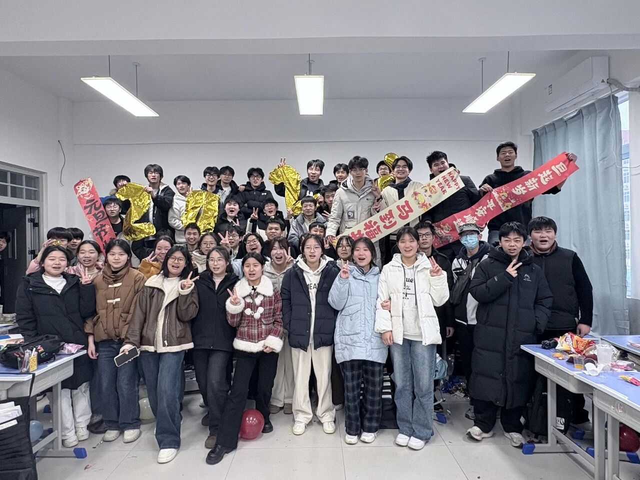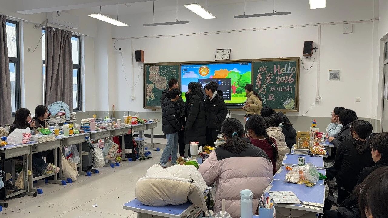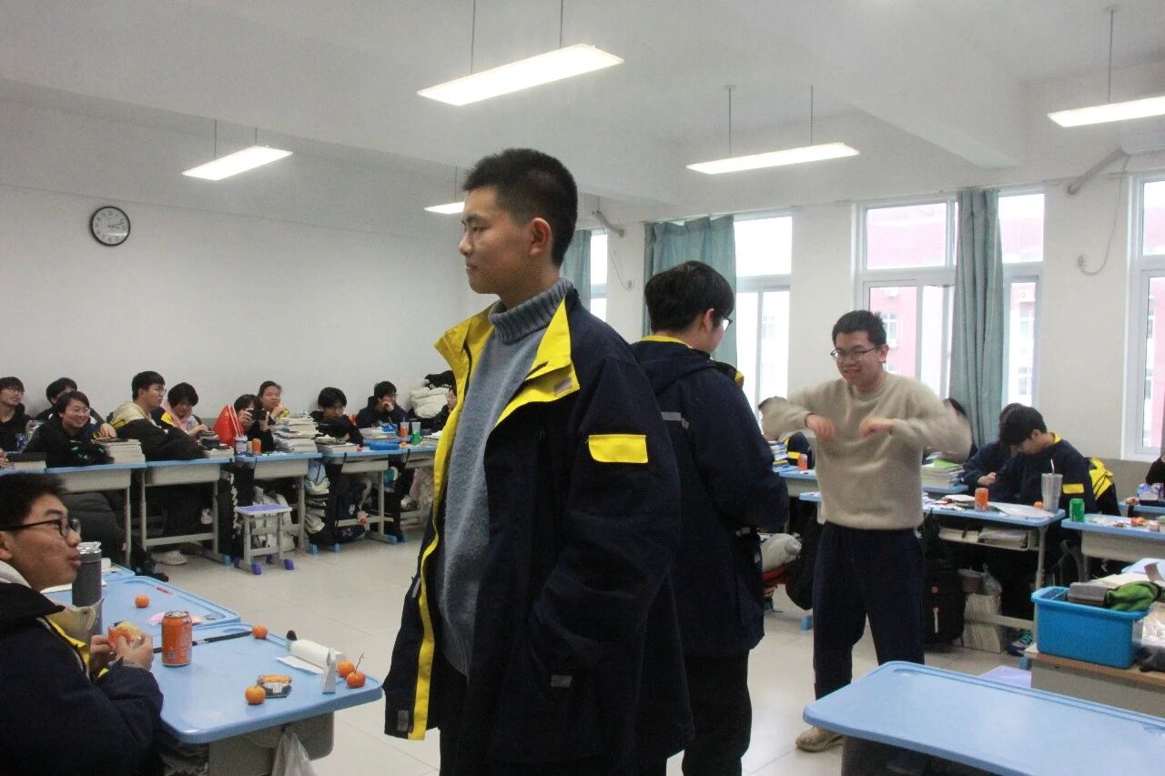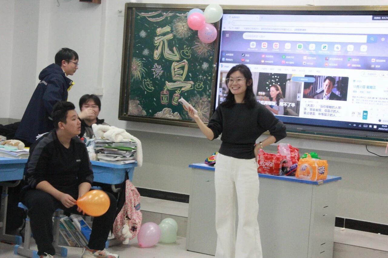 金声玉振辞旧岁,欢歌笑语迎新年。步入教室,浓浓的年味扑面而来,每间教室都化作创意满满的欢乐天地。同学们匠心巧思,将红灯笼、春联与寓意吉祥的中国结悬挂其间,黑板上,“龙马精神”“策马逐梦”等主题板报色彩鲜亮、字迹工整,既饱含对新年的期许,又彰显着青春的志向;五彩气球与缤纷彩带交织缠绕,水果零食整齐摆放,让教室成为充满温情与欢乐的海洋,处处洋溢着辞旧迎新的喜庆氛围。