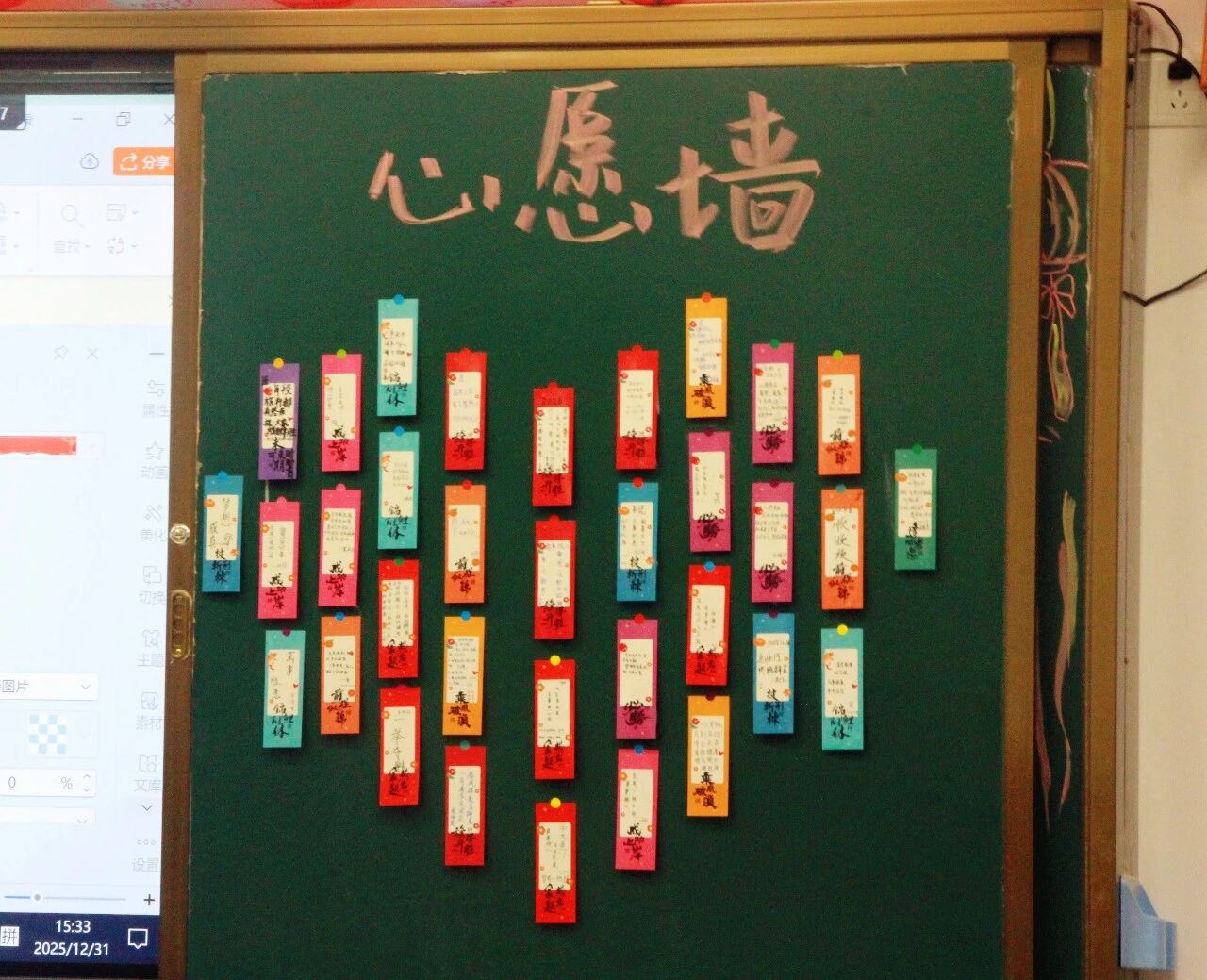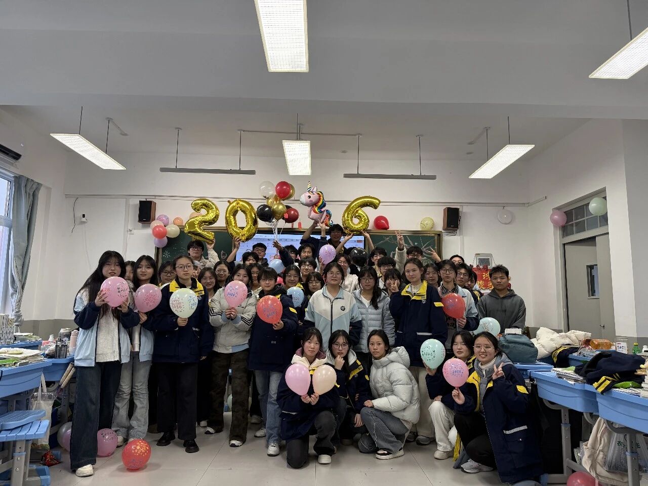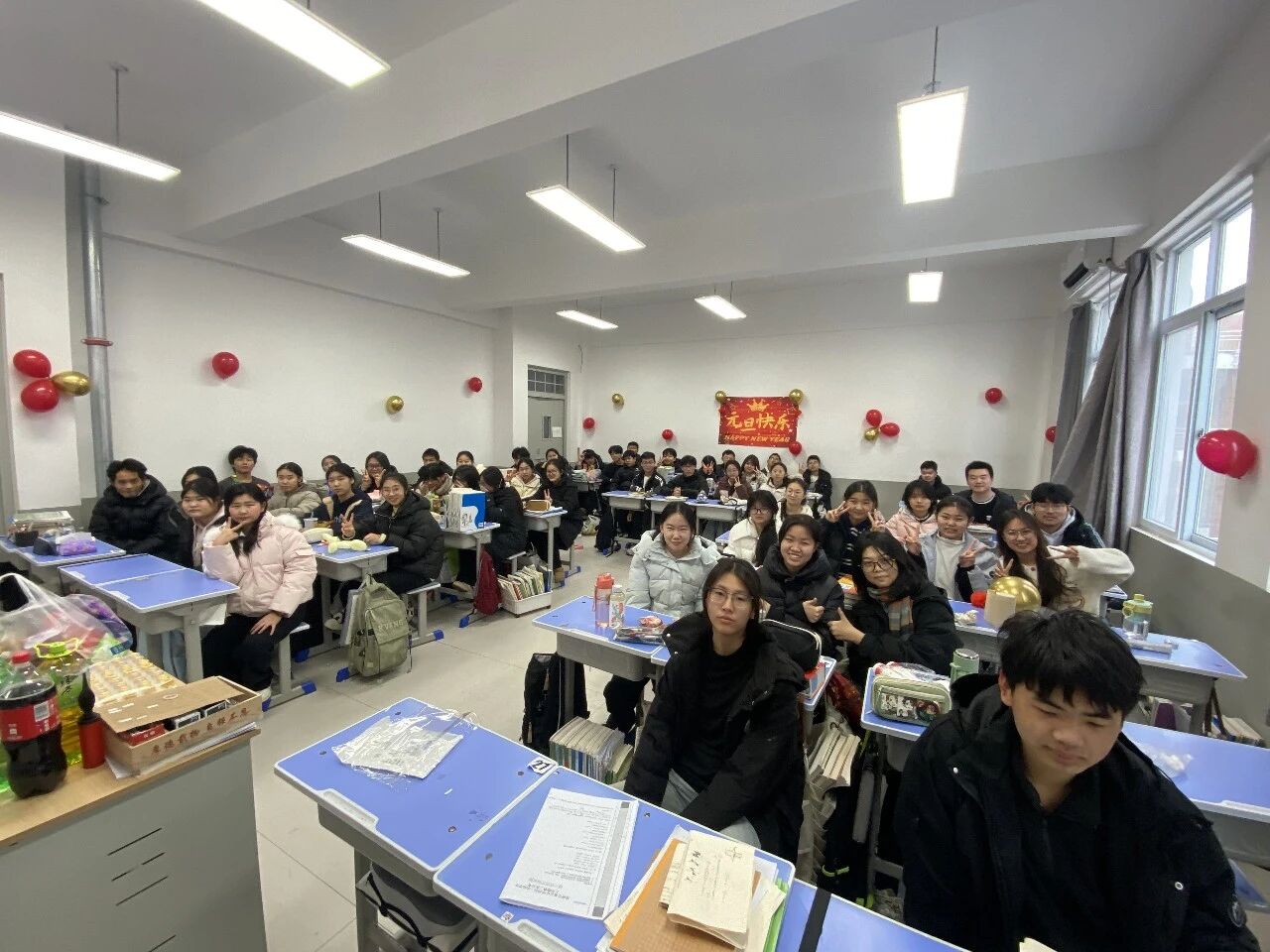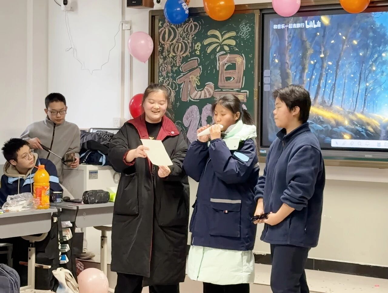 金声玉振辞旧岁,欢歌笑语迎新年。步入教室,浓浓的年味扑面而来,每间教室都化作创意满满的欢乐天地。同学们匠心巧思,将红灯笼、春联与寓意吉祥的中国结悬挂其间,黑板上,“龙马精神”“策马逐梦”等主题板报色彩鲜亮、字迹工整,既饱含对新年的期许,又彰显着青春的志向;五彩气球与缤纷彩带交织缠绕,水果零食整齐摆放,让教室成为充满温情与欢乐的海洋,处处洋溢着辞旧迎新的喜庆氛围。