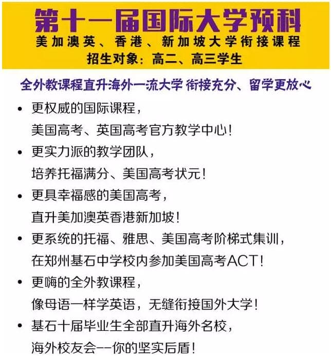 第十一届国际大学预科,年前已迎来了一批新同学,欢迎各位“归队”!新的班级、新的奋斗目标,Byebye河南高考,Hello世界名校!希望大家续写基石的录取记录——100%本科直升海外一流大学!基石最好的做法是循序渐进,任何值得到达的地方,都没有捷径。希望各位爸妈、各位同学在今后的14个月里面,配合好教学团队、配合好大学申请团队,基石的目标不仅仅是进入名校,是让学生能够无缝衔接海外大学,走的更稳、更远!
