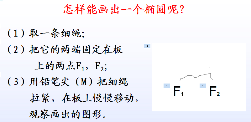 在讲完本节课的学习目标之后,李婉茹老师巧妙的以“怎样能画出一个椭圆呢”为敲门砖,带领班里同学进入椭圆及其标准方程式的数学世界。