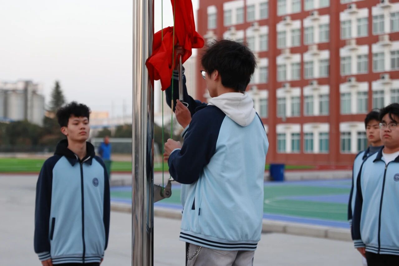 国歌响起,鲜艳的五星红旗冉冉升起,同学们肃立注目,心中充满对祖国的敬意和自豪。