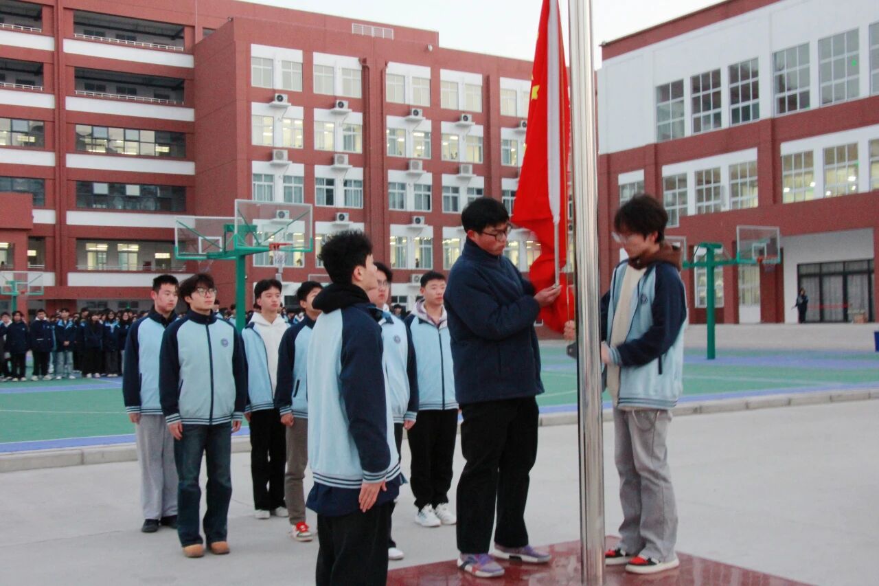 清晨,天色破晓,高二年级师生早已赶到操场,怀着崇敬的心情等待着升旗仪式的开始。本次活动以“安全守护、书香成长、榜样激励”为主题,在庄重的仪式感中传递责任与力量,为冬日校园注入奋进暖流。