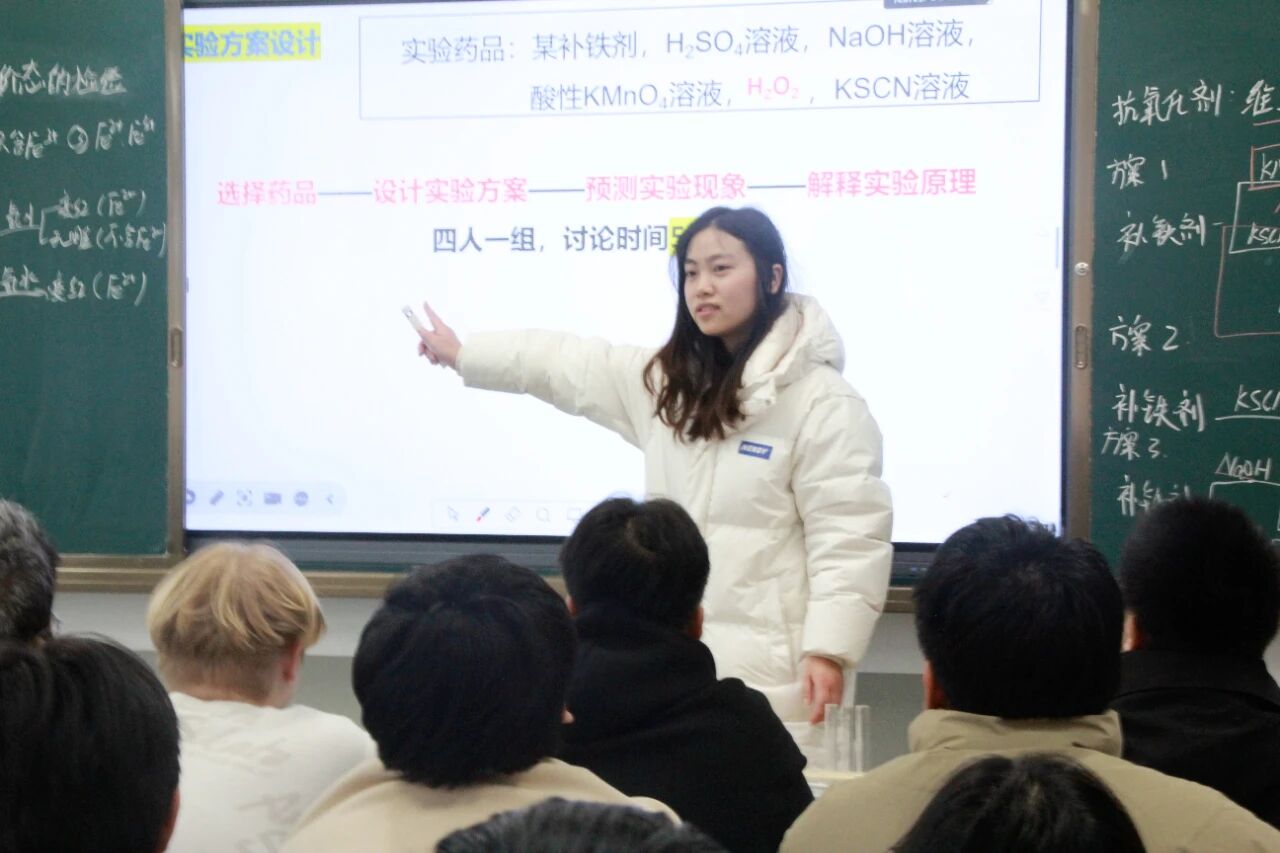 曹老师在实验研究课堂上引导学生设计实验方案、预测现象并解释原理。通过分组讨论与多情境问题设计,学生不仅掌握了铁元素价态的检验,还学会了在复杂体系中排除干扰、科学推理的实验思路。通过对比分析、反思迁移,提升了学生解决实际问题的能力。