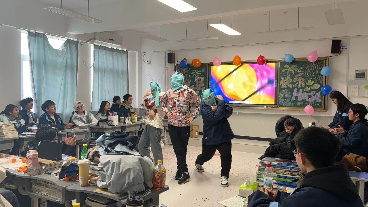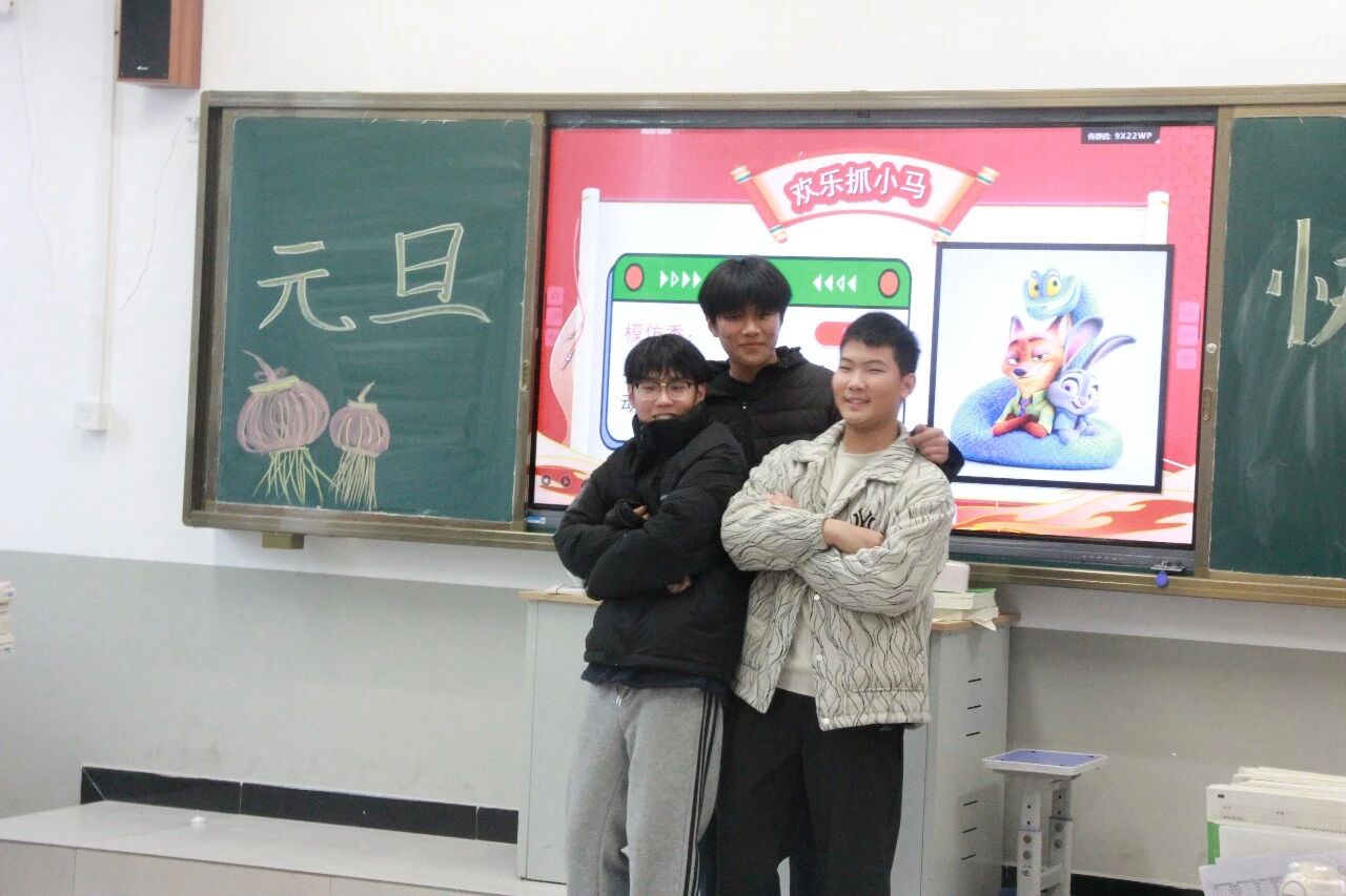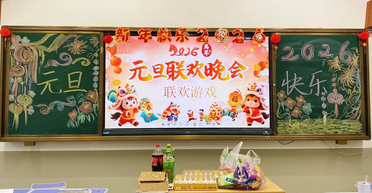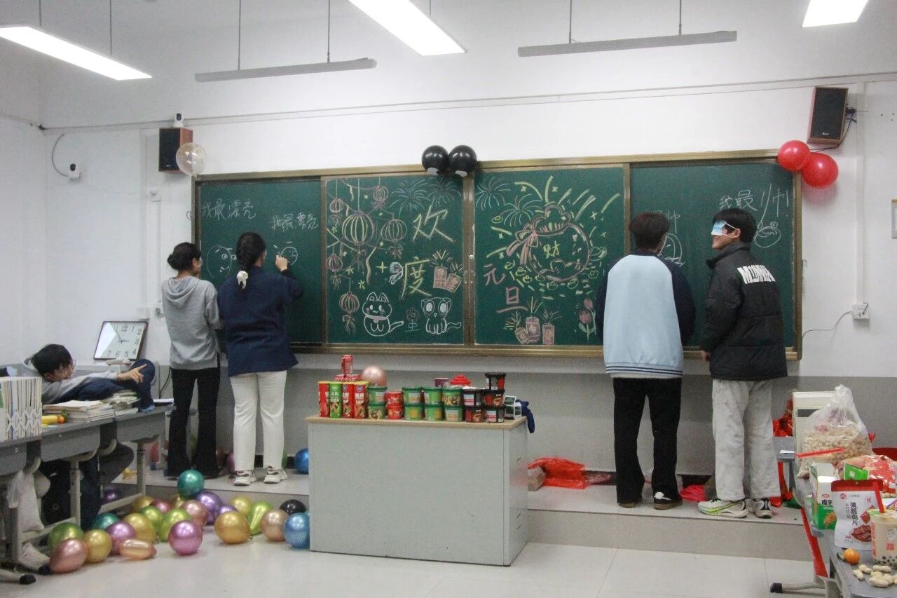 金声玉振辞旧岁,欢歌笑语迎新年。步入教室,浓浓的年味扑面而来,每间教室都化作创意满满的欢乐天地。同学们匠心巧思,将红灯笼、春联与寓意吉祥的中国结悬挂其间,黑板上,“龙马精神”“策马逐梦”等主题板报色彩鲜亮、字迹工整,既饱含对新年的期许,又彰显着青春的志向;五彩气球与缤纷彩带交织缠绕,水果零食整齐摆放,让教室成为充满温情与欢乐的海洋,处处洋溢着辞旧迎新的喜庆氛围。