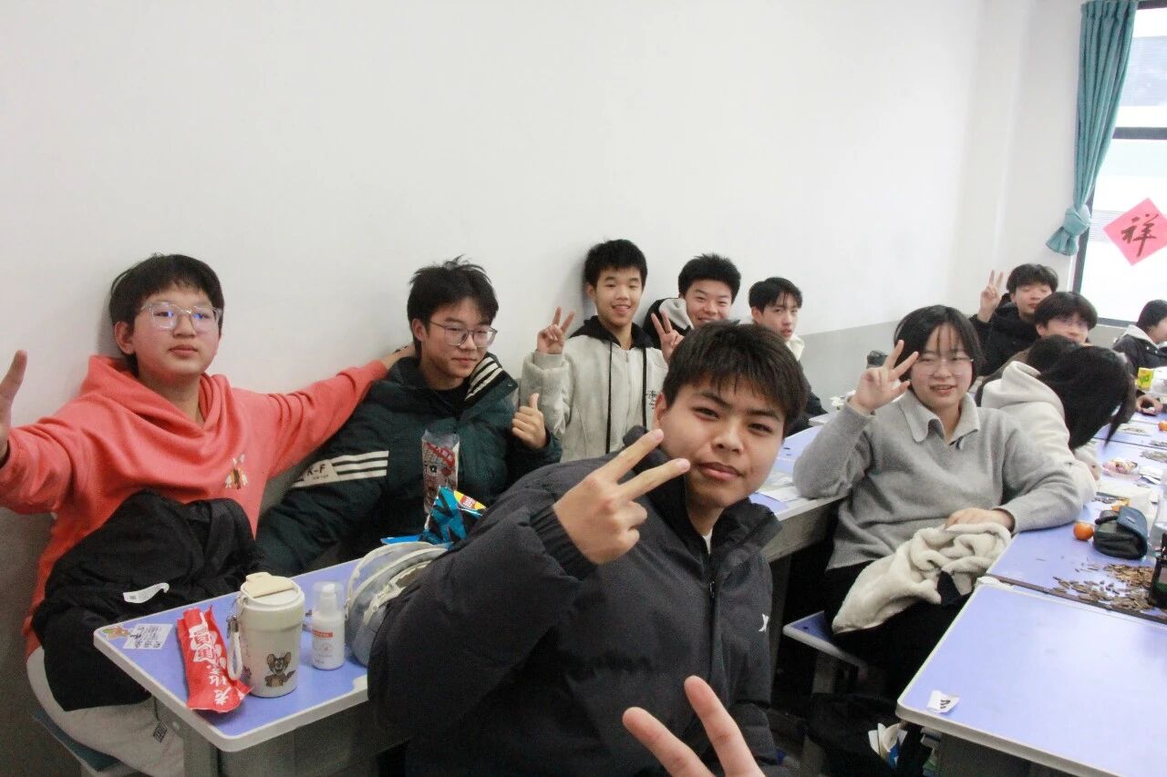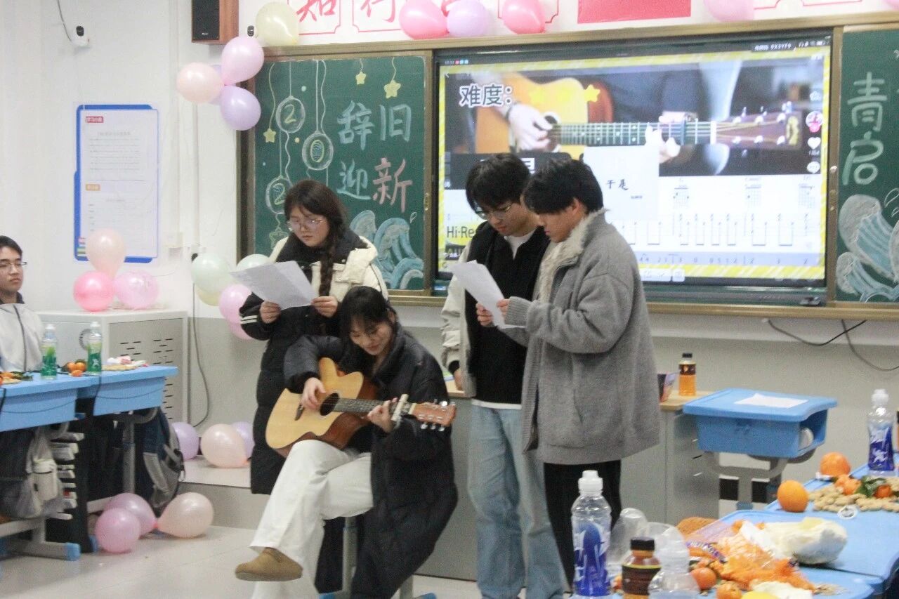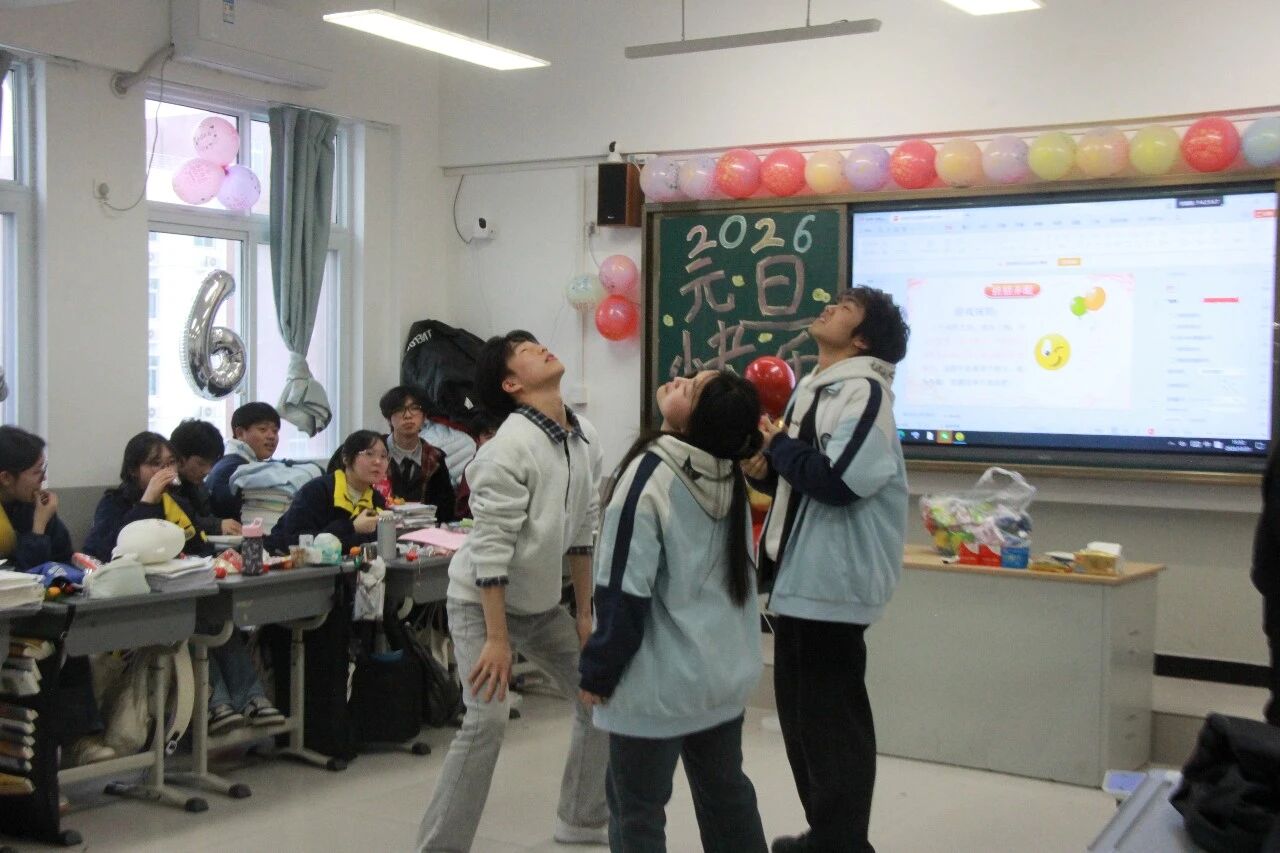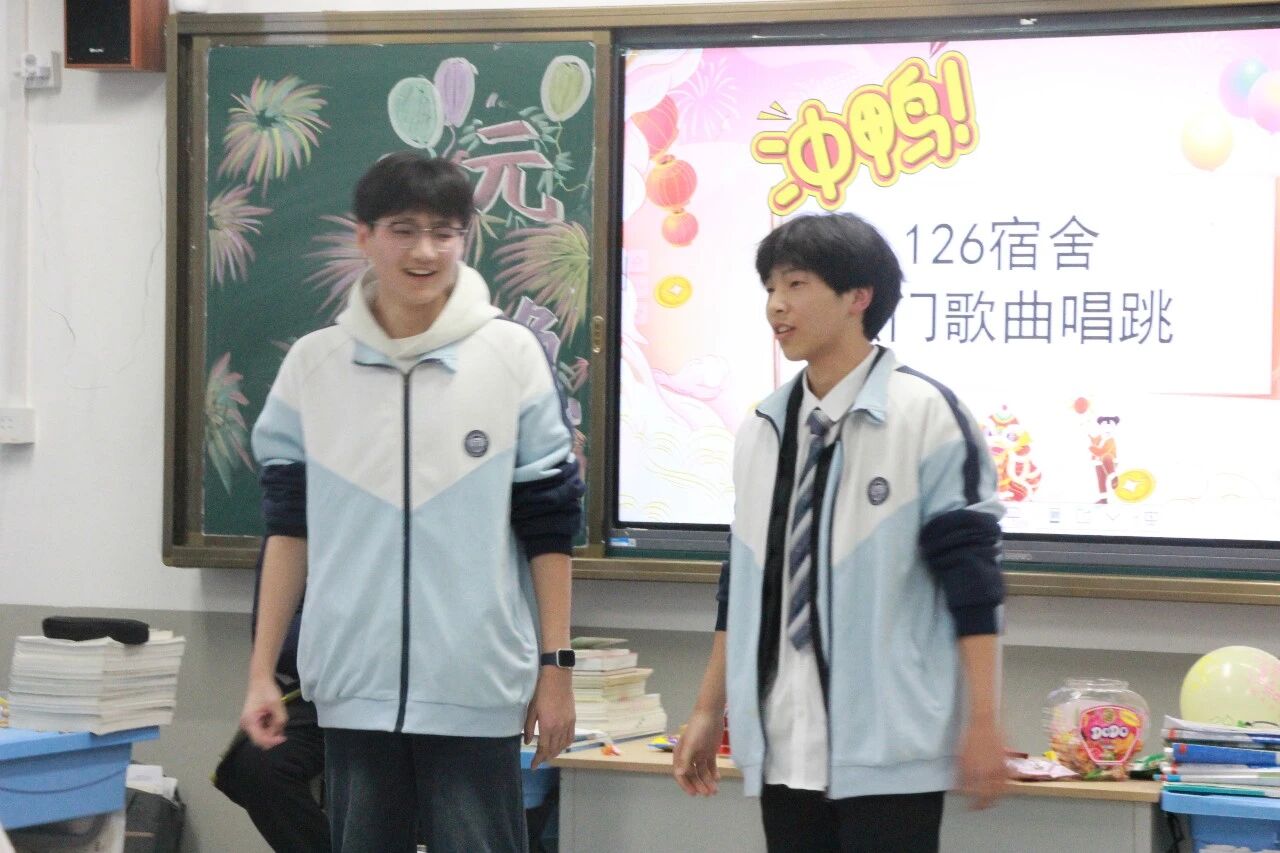 金声玉振辞旧岁,欢歌笑语迎新年。步入教室,浓浓的年味扑面而来,每间教室都化作创意满满的欢乐天地。同学们匠心巧思,将红灯笼、春联与寓意吉祥的中国结悬挂其间,黑板上,“龙马精神”“策马逐梦”等主题板报色彩鲜亮、字迹工整,既饱含对新年的期许,又彰显着青春的志向;五彩气球与缤纷彩带交织缠绕,水果零食整齐摆放,让教室成为充满温情与欢乐的海洋,处处洋溢着辞旧迎新的喜庆氛围。