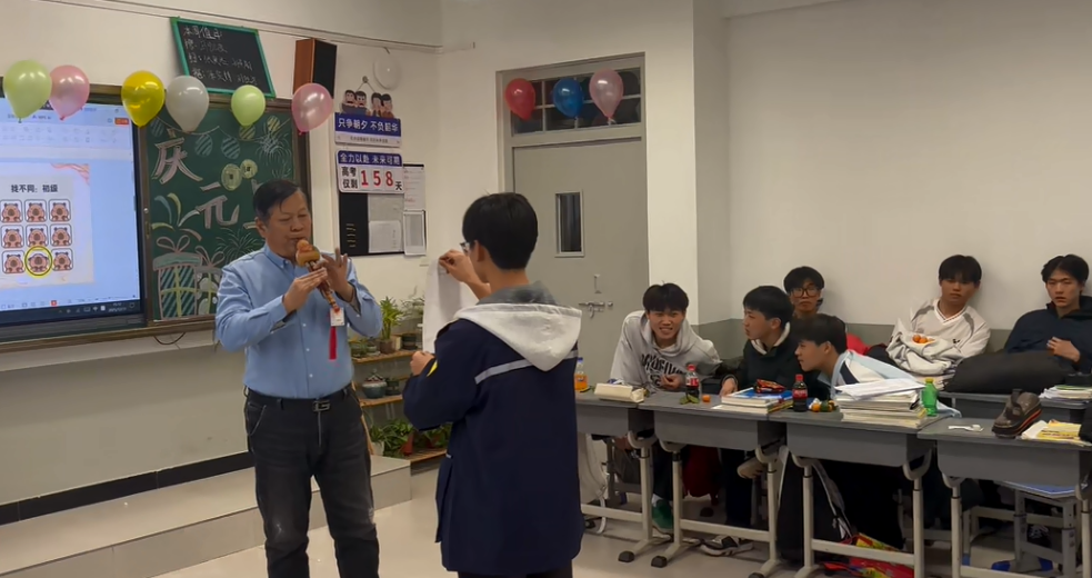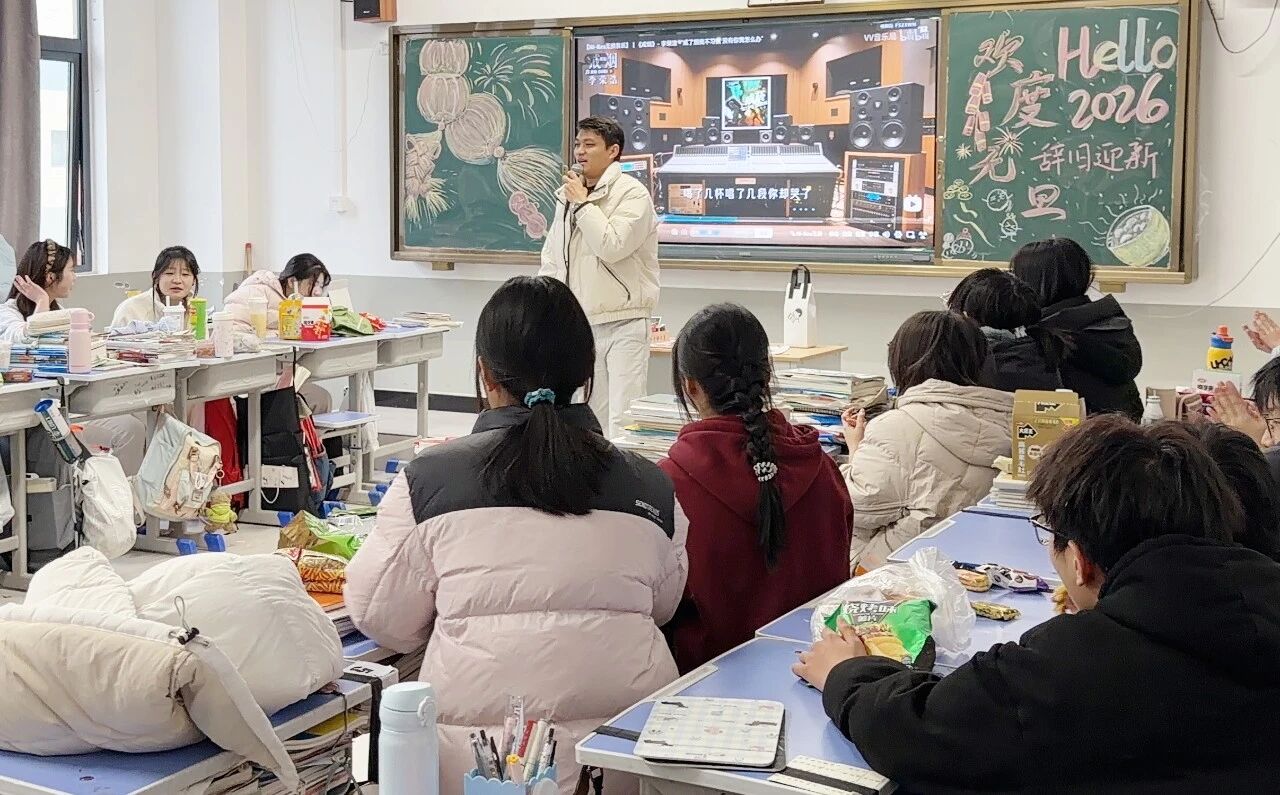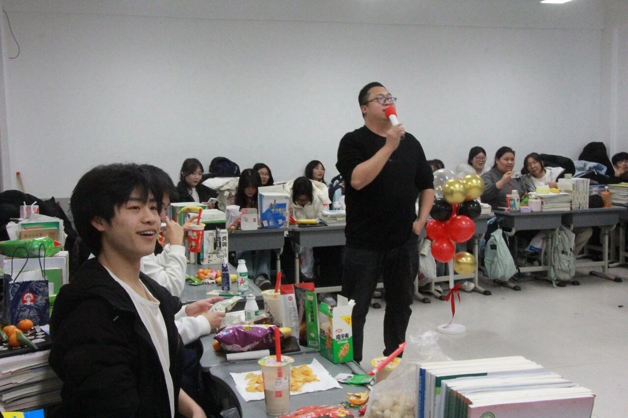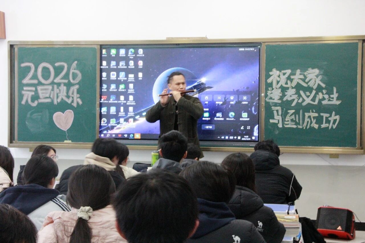 各班节目精彩纷呈,既有深情婉转的流行金曲,也有激昂奋进的励志旋律;舞蹈表演活力四射,同学们踏着欢快节拍舒展身姿,将少年意气展现得淋漓尽致;趣味游戏环节更是热闹非凡,“你表演我猜”“欢乐抓小马”等互动游戏让师生们踊跃参与,掌声、笑声、欢呼声此起彼伏,瞬间点燃现场气氛。尤为亮眼的是,音乐艺术老师们走进各班课堂,带来了专业的乐器表演,悠扬的琴声、婉转的笛音与同学们的欢呼声交织,让班级联欢更添艺术韵味,尽显“亦师亦友”的融洽氛围。