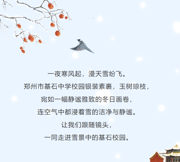 “白雪却嫌春色晚,故穿庭树作飞花”。皑皑白雪如时光的留白,既装点了校园的冬景,也映照出基石学子披星戴月的奋斗征程。愿基石中学每一位为梦想奋力冲刺的学子,都能铭记今日奋斗的逐梦征程,终会抵达华枝春满、繁花似锦的美好明天。