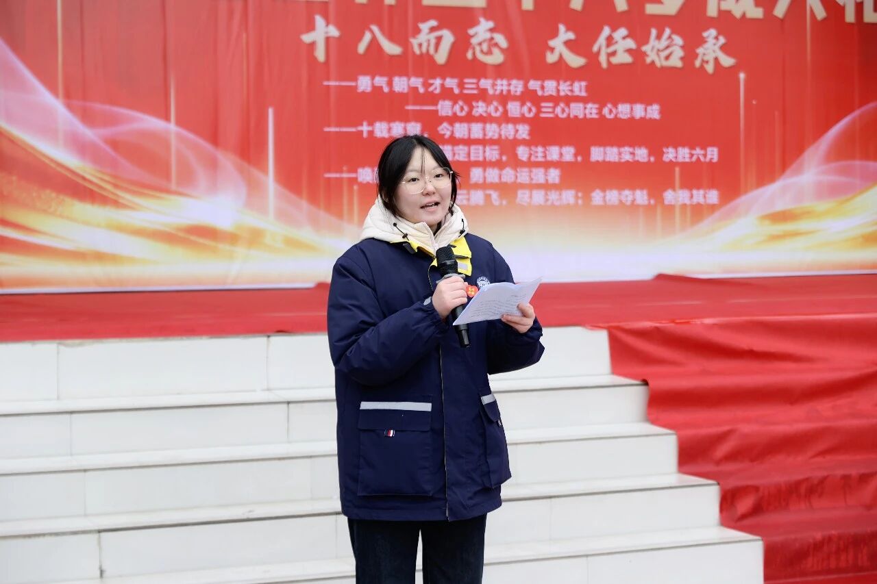 高三(1)班袁佳欣同学上台发言,她回顾了高中三年的成长历程,感恩父母的养育、恩师的教诲,并号召全体同学珍惜百日光阴,以破釜沉舟的勇气迎战高考,用汗水浇灌梦想,用坚持成就未来。