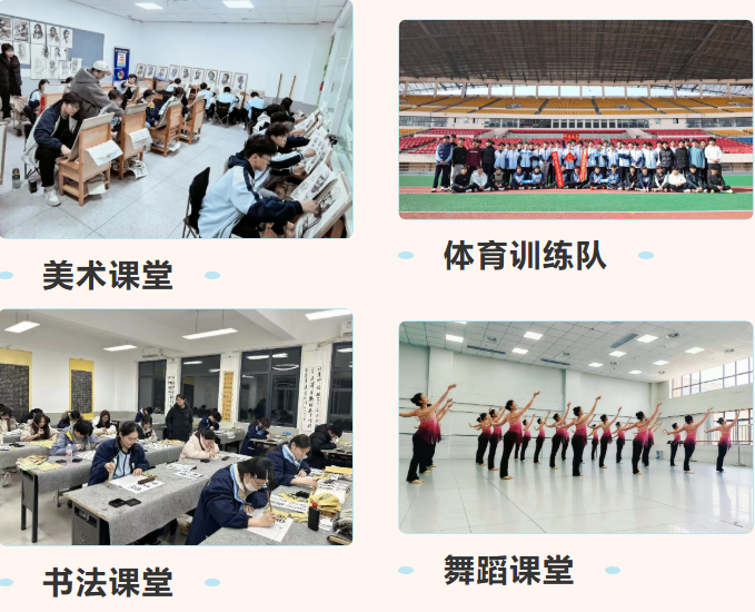 学校以学生需求为导向,开设美术、书法、体育、音乐、舞蹈、播音主持等特长班进行专业培养,采用小班化教学与个体专项辅导,夯实专业基础,同时注重文化课学习,形成了“基础学科教学+艺体专项训练+综合素质提升”的教学体系,辅以“小语种”特色,多重保障,助力高考升学。凭借扎实的文化课成绩与专业功底,我校艺术生升学屡创佳绩,多名学子考入华中师范大学、中央戏剧学院、四川美术学院、河南大学等国内知名院校,升学成果显著。