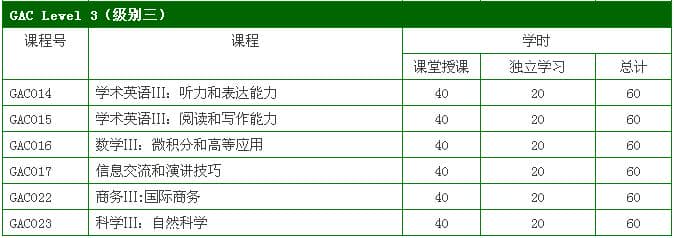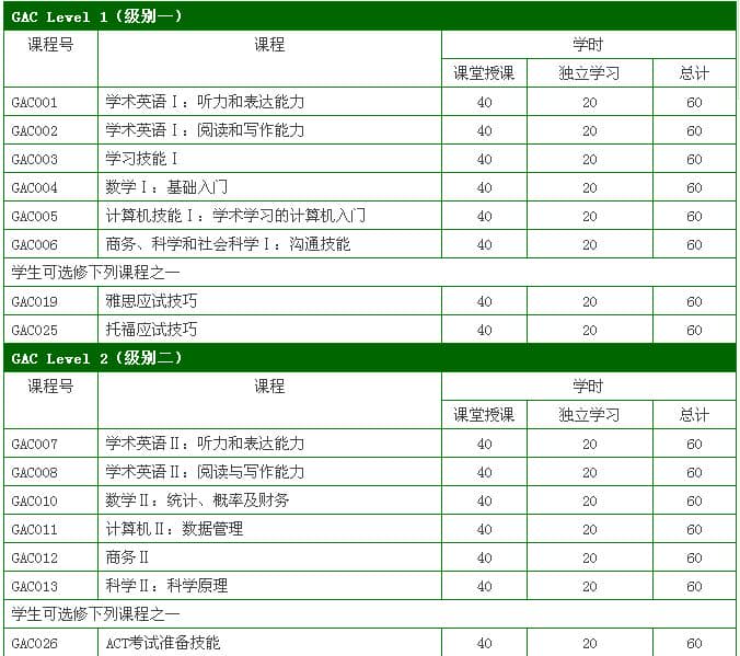 GAC课程必修课的总时长为1080个小时(720个小时课堂学习加上360个小时独立学习)。ACT应试技巧、托福应试技巧、雅思应试技巧作为选修课,帮助学生熟悉考试结构、考试时间和题型。