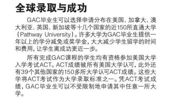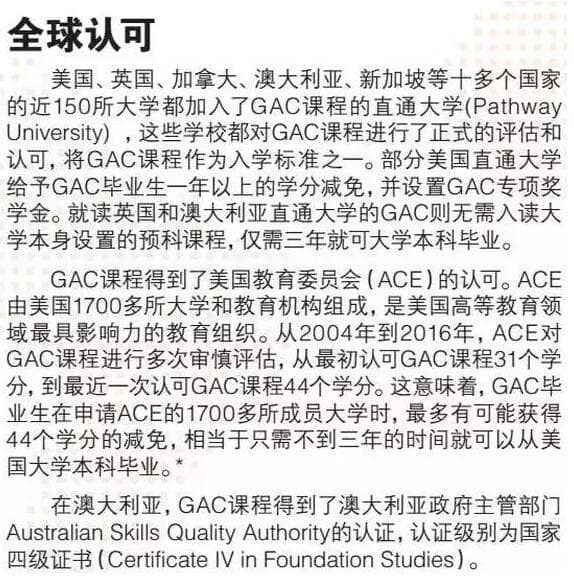 GLOBAL ASSESSMENT CERTIFICATE(英文缩写GAC)全球大学入学评估课程,由ACT Education Solutions(AES)研发并管理,是全球广泛认可的海外大学预备课程。