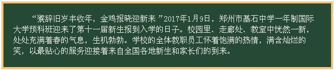 第十一届国际大学预科,年前已迎来了一批新同学,欢迎各位“归队”!新的班级、新的奋斗目标,Byebye河南高考,Hello世界名校!希望大家续写基石的录取记录——100%本科直升海外一流大学!基石最好的做法是循序渐进,任何值得到达的地方,都没有捷径。希望各位爸妈、各位同学在今后的14个月里面,配合好教学团队、配合好大学申请团队,基石的目标不仅仅是进入名校,是让学生能够无缝衔接海外大学,走的更稳、更远!