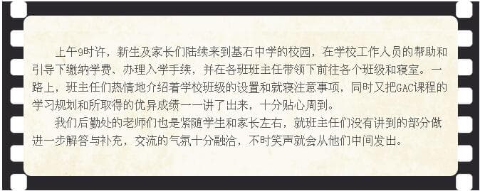 一位张姓的新生家长代表对小编说,经过一天的报到和聆听,自己收获颇多,十分认同基石中学的治校理念,并觉得基石中学的班主任都是一群懂教学、会管理、很贴心的老师,相信自家孩子在他们的全程辅导下一定可以考进孩子希望进入的国外大学。