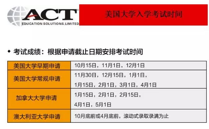 ACT-American College Test, 也就是“美国高考”被称为最适合中国学子的留学考试,是申请美国大学的入学条件之一,同时也是院校发放奖学金的重要参考依据。ACT考试广泛地被美国大学所认可,是因为ACT更强调考察学生对知识的掌握程度和灵活运用程度,并考察学生的独立思考能力和判断力。ACT的题量相对大些,这要求学生要安排好答题时间,在有限的时间内尽可能完成更多的题目。在难度上,ACT相对简单一些。目前国内考生主要申请ACT考试。今天,小编将为大家带来详细的ACT考试介绍。